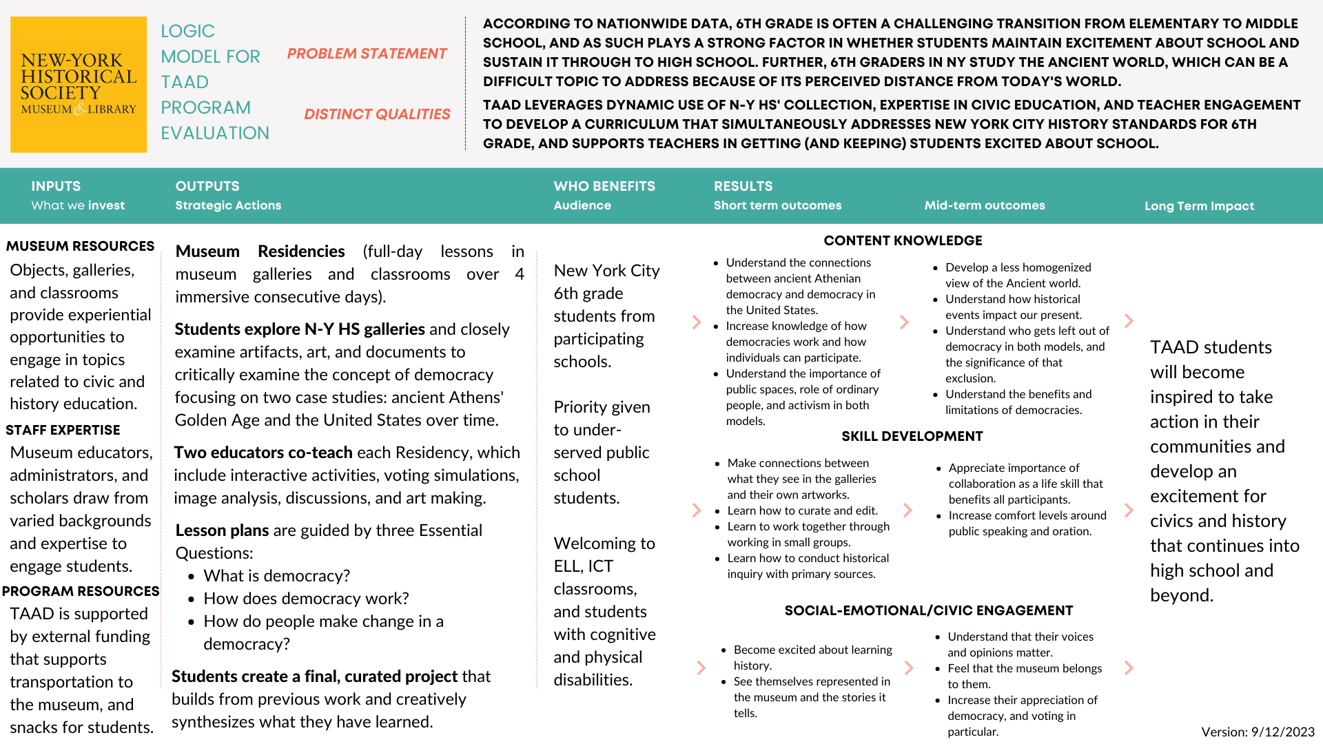 I collaboratively developed a Logic Model (see below) with TAAD program staff to define measurable outcomes of the program. These outcomes served as guideposts to develop instruments for the following phases.